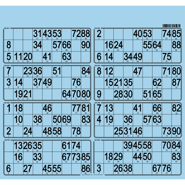 Are you looking for a way to liven up your bingo games even more? The 63 bingo boards containing 8 grids are perfect for you! Imagine the adrenalin rush every time a number comes up and your players see their grids filling up! These bingo boards are printed on single-use or reduced-use paper, allowing players to use either chips or dabbers. You can choose to include all 90 numbers so that a number can be marked off every time (grouped numbering), or random numbering to keep things a little more exciting.