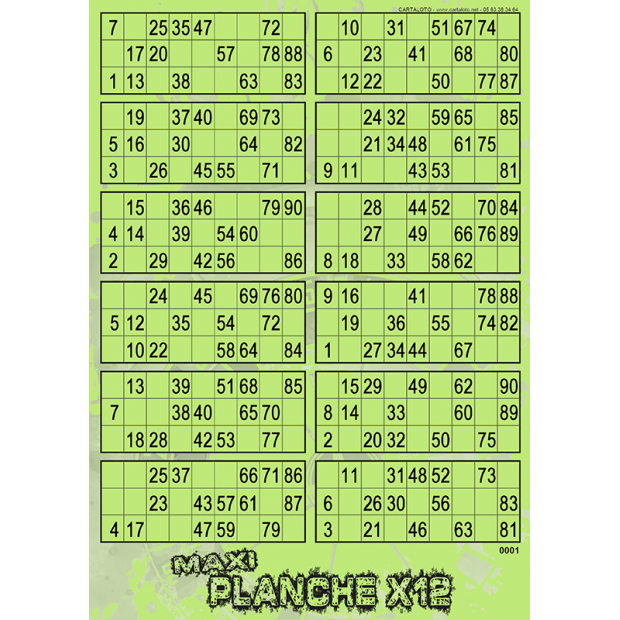 Maximisez vos chances de gagner au loto avec cette Maxi planche de 12 grilles. Parfait à mettre en place pour une partie exceptionnelle lors d'une soirée loto. La Maxi planche de loto contient 12 grilles classiques et peut donc, également, être utilisée lors d'une partie normale.